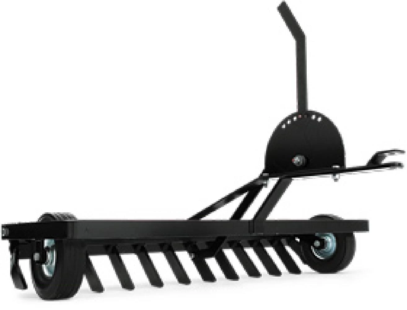 Robuste Schotterharke mit Gummirädern und verstellbarer Arbeitstiefe. Die Zinken werden beim Rückwärtsfahren hochgestellt.