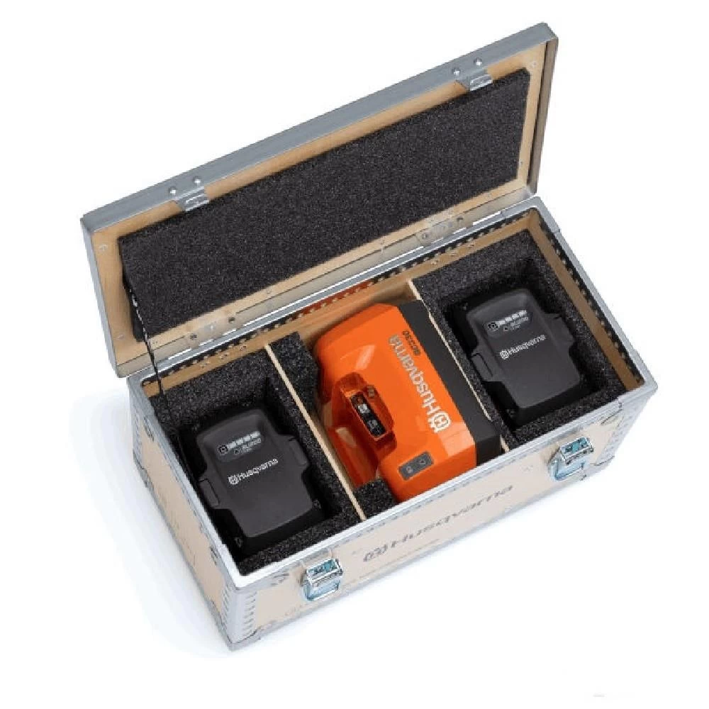 Transportbox aus verstärktem Holz für zwei Akkus und Ladegerät, mit Einsatz.